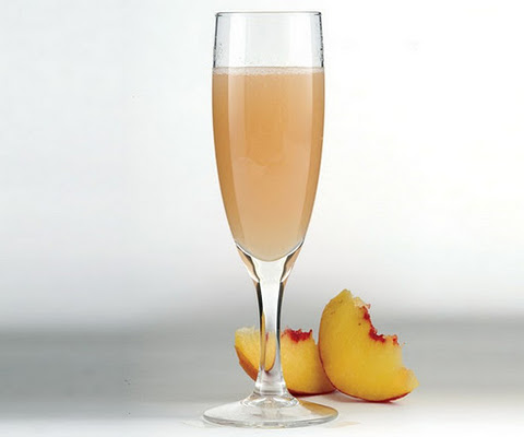 Βάζουμε τον πολτό σε ένα παγωμένο ποτήρι και γεμίζουμε σιγά σιγά το υπόλοιπο με σαμπάνια. Ανακατέυουμε ελαφρά.