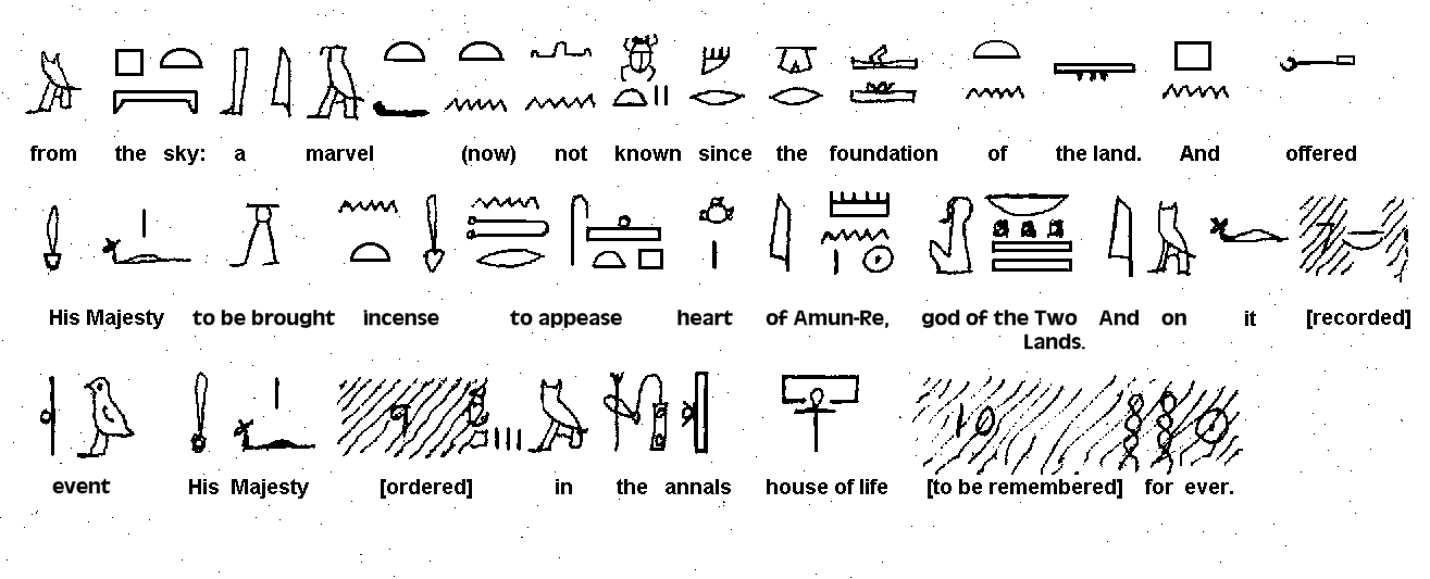 Συγκεκριμένα, ο πάπυρος γράφει τα εξής: ''Στο έτος 22, τον τρίτο μήνα του χειμώνα, στην έκτη ώρα της ημέρας, οι γραφείς της Βουλής παρατήρησαν έναν πύρινο δίσκο που ερχόταν από τον ουρανό. Δεν έκανε θόρυβο και οι γραφείς του Φαραώ ταραγμένοι έπεσαν κάτω στο χώμα. Έπειτα αυτοί εξέθεσαν το γεγονός στο Φαραώ.