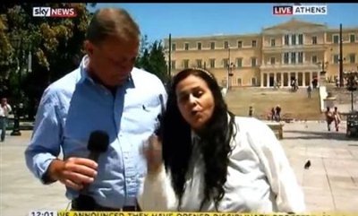 Ο ανταποκριτής του Skynews στο Σύνταγμα, όμως, όταν έγινε η σύνδεση με το δίκτυο για να μεταφέρει τα τελευταία νέα, είχε… συνάντηση με μία, όπως την αποκάλεσε, εξαγριωμένη Ελληνίδα. Αυτή δεν ήταν άλλη από την Ελένη Λουκά!