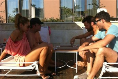 Τη φωτογραφία ανέβασε η Μαριάντα Πιερίδη στο twitter της... σχολιάζοντας:μαθήματα τάβλι από τον Σταμάτη Γονίδη σε Κωνσταντίνο Αργυρό και Κωνσταντίνο Γαλανό. Όπως βλέπετε, η παρέα είναι καθισμένη στην άκρη της πισίνας, σε ξενοδοχείο της Θεσσαλονίκης και ασκείται στο εθνικό μας άθλημα. Η Μαριάντα παρακολουθεί και χαρίζει το... γούρι της στον Σταμάτη Γονίδη! Αυτά είναι...