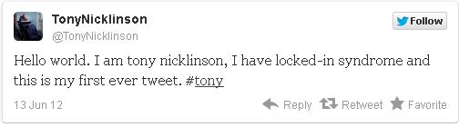 Στις 13 Ιουνίου έγραψε: «Γεια σας, είμαι ο tony nicklinson, έχω σύνδρομο αποκλεισμού και αυτό είναι το πρώτο μου tweet. #tony.