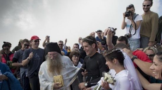 Μετά τις απαραίτητες ευχές και φωτογραφίες, το ζευγάρι, μαζί με τους κουμπάρους τους, επίσης μαραθωνοδρόμους του βουνού, πήραν το μονοπάτι για την κατάβαση, συμμετέχοντας στον Μαραθώνιο Ολύμπου.
