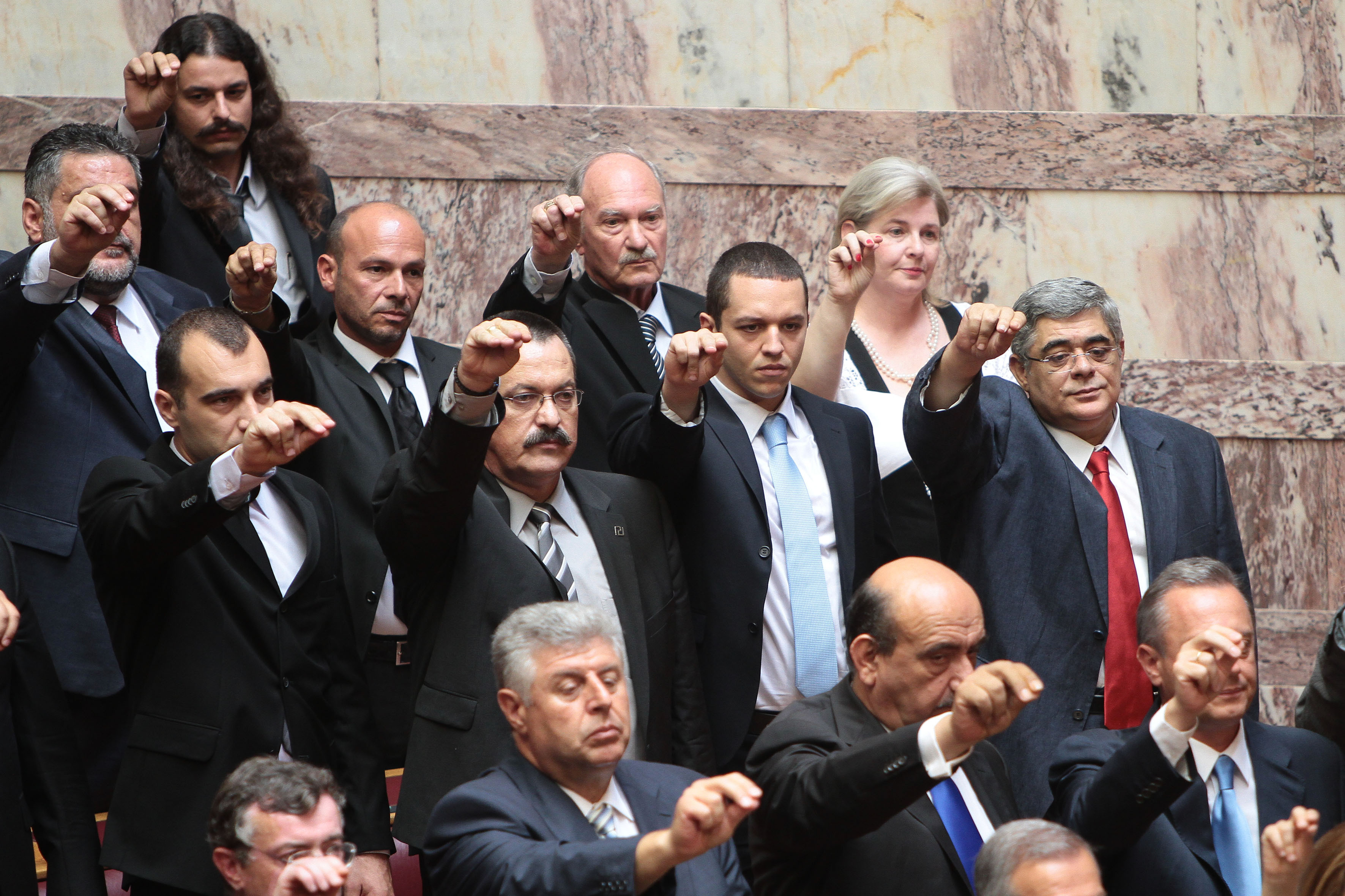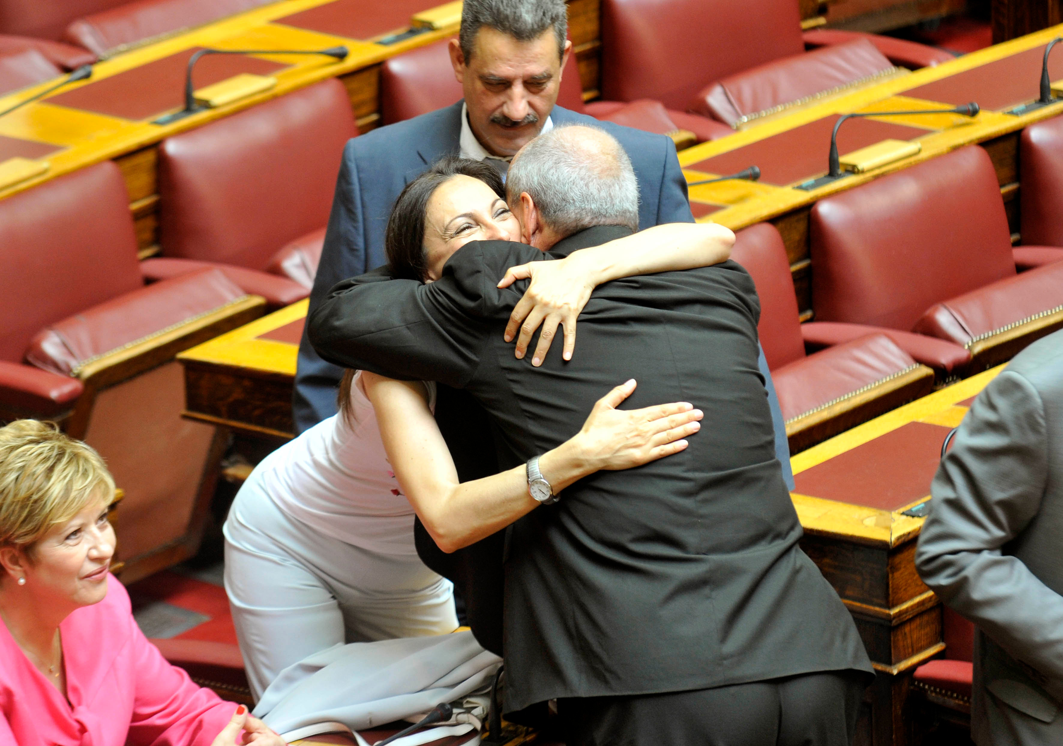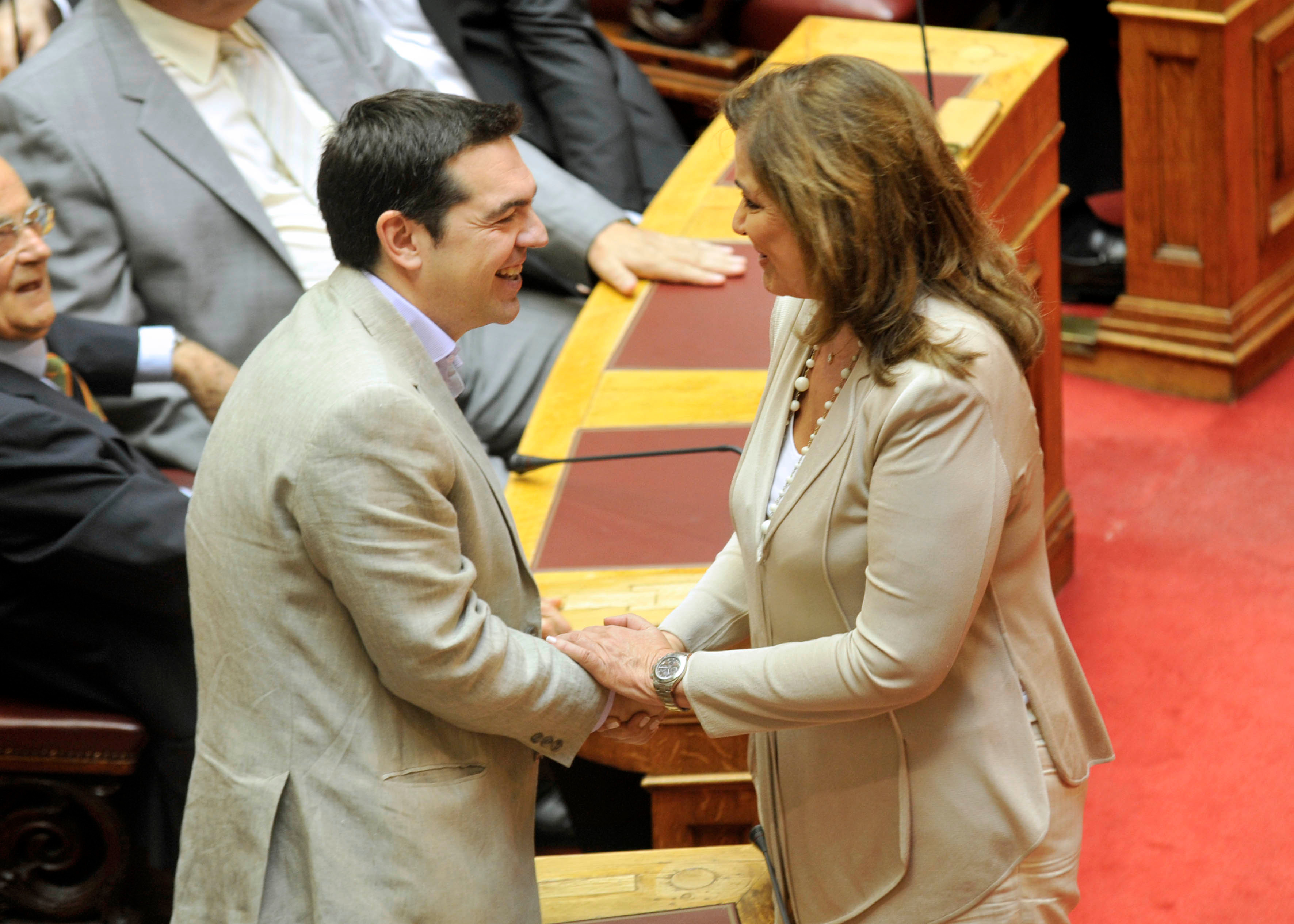 Ώρα 11.45: ο πρόεδρος Ιωάννης Τραγάκης καλεί τους βουλευτές να σηκωθούν όρθιοι και να δώσουν τον οριζόμενο από το Σύνταγμα όρκο ενώνοντας τον αντίχειρα και το δείκτη του δεξιού τους χεριού. Δεν ύψωσαν το χέρι οι βουλευτές του ΚΚΕ εκτός από την κ. Λιάνα Κανέλλη. Το χέρι ύψωσαν 9 βουλευτές της ΔΗΜΑΡ και 6 βουλευτές του ΣΥΡΙΖΑ.