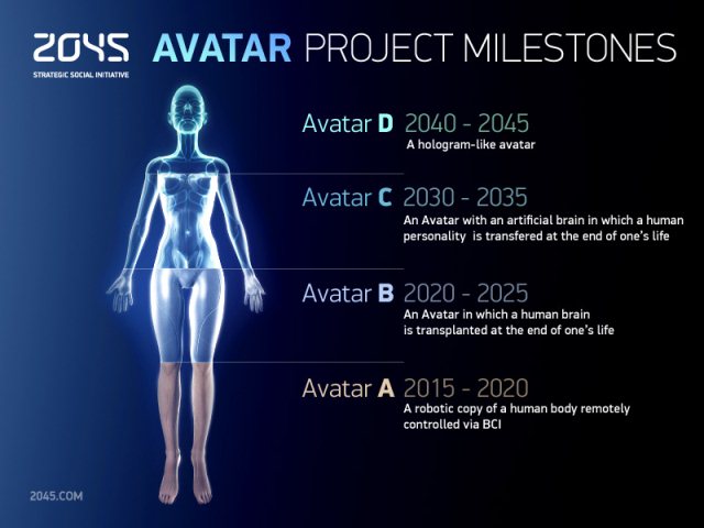 Το πρώτο σκέλος, το οποίο ο Itsikov ελπίζει να ολοκληρωθεί μέχρι το 2020 είναι η δημιουργία ενός ρομπότ «avatar», το οποίο οι άνθρωποι θα μπορούν να ελέγχουν με τον εγκέφαλό τους.