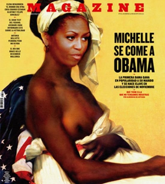 Θύελλα αντιδράσεων έχει ξεσηκώσει το εξώφυλλο του Ισπανικού περιοδικού Magazine στο οποίο εμφανίζεται η σύζυγος του Αμερικανού Προέδρου ως γυμνόστηθη σκλάβα.Η φωτογραφία είναι προϊόν Photoshop καθώς το αρχικό πορτρέτο είναι αντίγραφο του πασίγνωστου πίνακα του Marie Benoist Guillemine "Το πορτρέτο μίας νέγρας" που είχε φιλοτεχνηθεί στα 1800 και αποτέλεσε σύμβολο ελευθερίας και δικαιωμάτων έγχρωμων ανδρών και γυναικών. Στη Γαλλία η δουλεία είχε καταργηθεί πριν από έξι χρόνια κι αυτός ήταν τρόπος... εορτασμού των ανθρώπινων δικαιωμάτων. Ο τίτλος μάλιστα του περιοδικού γράφει "η Μισέλ 'τρώει τον Ομπάμα" - Η γυναίκα εγγονή ενός σκλάβου, Κυρία της Αμερικής", καθώς τόσο ο προπάππους όσο και η προγιαγιά της Μισέλ Ομπάμα ήταν σκλάβοι. Στο Διαδίκτυο, ωστόσο, δεν έχει κυκλοφορήσειο το ακριβές περιεχόμενο του άρθρου το οποίο είναι άκρως τιμητικό για τη Μισέλ Ομπάμα, με αποτέλεσμα πολλοί να το θεωρούν από προσβλητικό έως ρατσιστικό!