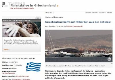 Συμφωνία Ελλάδας και Ελβετίαςετοιμάζεται να υπογραφεί το Σεπτέμβριο ανάμεσα στις δύο χώρες, για τη φορολόγηση των καταθέσεων που έχουν μεταφέρει Έλληνες σε ελβετικές τράπεζες. Το γερμανικό περιοδικό «Der Spiegel» υποστηρίζει ότι η φορολογική αυτή συμφωνία ήταν στα θέματα που συζήτησε ο Έλληνας πρωθυπουργός, κ. Αντώνης Σαμαράς και η Γερμανίδα καγκελάριος, Άνγκελα Μέρκελ.