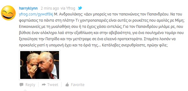 Σχόλιο του Χάρρυ Κλυνν στο yfrog.com για τις δηλώσεις Μίμη Ανδρουλάκη: Μ. Ανδρουλάκης: «Δεν μπορείς να τον ταπεινώνεις τον Παπανδρέου. Να του φορτώσεις τα πάντα στη πλάτη» Τι χοντροπ@π@ριές είναι αυτές οι ρουκέτες που αμολάς ρε Μίμη; Επικοινωνείς με τη μυαλοθήκη σου ή τα έχεις χάσει εντελώς; Για τον Παπανδρέου μιλάμε ρε, που βύθισε έναν ολόκληρο λαό στην εξαθλίωση και στην αβεβαιότητα, για ένα πουλημένο τομάρι που ξεπούλησε την Πατρίδα και την μετέτρεψε σε ένα ελεεινό προτεκτοράτο. Σταμάτα λοιπόν να προκαλείς γιατί η υπομονή έχει και τα όριά της… Κατάλαβες ανερυθρίαστε, πρώην φίλε; trelokouneli