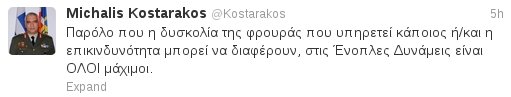 Ένα σχόλιο με ειδικό βάρος έκανε σήμερα ο Αρχηγός ΓΕΕΘΑ, Μιχάλης Κωσταράκος, μέσω του λογαριασμού του στο Twitter του, «απαντώντας» ουσιαστικά στα δημοσιεύματα που φέρουν την κυβέρνηση να διασώζει από τις περικοπές στα ειδικά μισθολόγια μόνο τους «μάχιμους» ενστόλους (ΟΥΚ, πιλότους κλπ). Ειδικότερα, ο κ. Κωσταράκος έγραψε στο Twitter του: Παρόλο που η δυσκολία της φρουράς που υπηρετεί κάποιος ή/και η επικινδυνότητα μπορεί να διαφέρουν, στις Ένοπλες Δυνάμεις είναι ΟΛΟΙ μάχιμοι.
