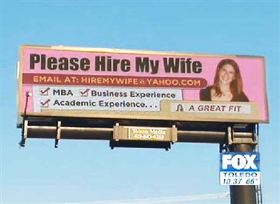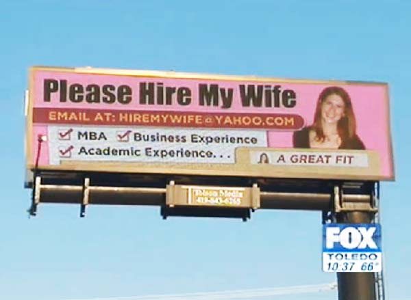 Ο Brandon Stuard βρήκε έναν πρωτότυπο τρόπο για να προβάλλει τα… επαγγελματικά προσόντα της συζύγου του, προκειμένου να τη βοηθήσει να βρει δουλειά, παρακινώντας παράλληλα τους επίδοξους εργοδότες με τη φράση «Παρακαλώ, προσλάβετε τη γυναίκα μου»! Πιο συγκεκριμένα, ο Brandon νοίκιασε μια διαφημιστική πινακίδα σε κεντρικό αυτοκινητόδρομο στο Οχάιο, αναγράφοντας τη φράση «Please, Hire my Wife» (σ.σ. «Παρακαλώ, προσλάβετε τη γυναίκα μου»), σε συνδυασμό με τα βασικά προσόντα της γυναίκας του (MBA, εργασιακή εμπειρία κ.ά) και ένα e-mail επικοινωνίας, μπροστά σε χιλιάδες νέα πρόσωπα.