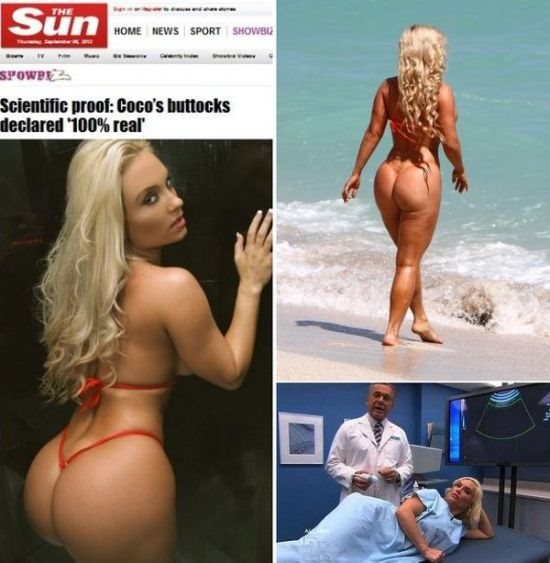 "Τα οπίσθια της Coco είναι 100% φυσικά", δήλωσε περήφανα ο γιατρός που έκανε τον υπέρηχο και το σκανάρισμα στο επίμαχο σημείο της τηλεπερσόνας, η οποία αποφάσισε να προβεί σ’ αυτήν την εξέταση on camera ώστε να πεισθούν και οι πιο δύσπιστοι.