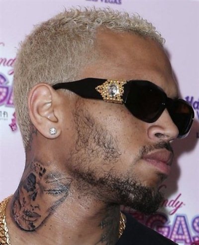 Το καινούργιο του τατουάζ κοσμεί το λαιμό του και πρόκειται για το μελανιασμένο πρόσωπο μιας γυναίκας που έχει πέσει θύμα ξυλοδαρμού. Ναι, όσο τρελό και να σας ακούγεται, μετά τον ξυλοδαρμό της τραγουδίστριας το 2009 ο Brown αποφάσισε να απαθανατίσει τη στιγμή χαράσσοντάς τη για πάντα πάνω του.