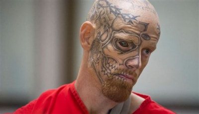 Γεμάτος σκελετούς, σταυρούς, ψεύτικα ράμματα στα χείλια και ένα τατουάζ ακόμα και μέσα στο... μάτι ο δράστης εμφανίστηκε στο δικαστήριο με την χαρακτηριστική πορτοκαλί φόρμα, καθώς συνελήφθη για επίθεση σε αστυνομικό.