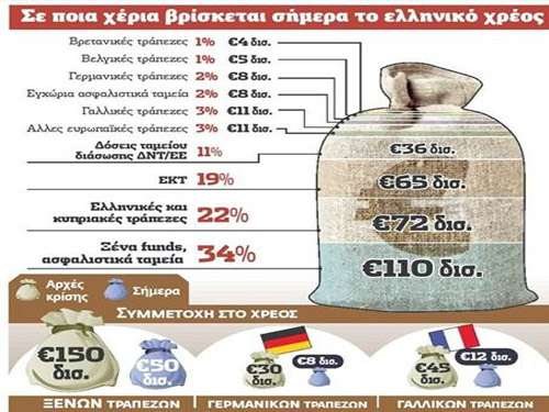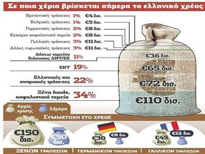 Σύμφωνα με τους υπολογισμούς της UΒS, οι μεγαλύτεροι κάτοχοι του ελληνικού χρέους είναι σήμερα ξένα ασφαλιστικά ταμεία και funds με 110 δισ. ευρώ, οι ελληνικές και κυπριακές τράπεζες με 72 δισ. ευρώ και η ΕΚΤ με 65 δισ. ευρώ. Με βάση στοιχεία της ΕΚΤ και της Ευρωπαϊκής Επιτροπής, στο τέλος του 2011 το δημόσιο χρέος της Ελλάδας θα διαμορφωθεί στα 345 δισ. ευρώ.
