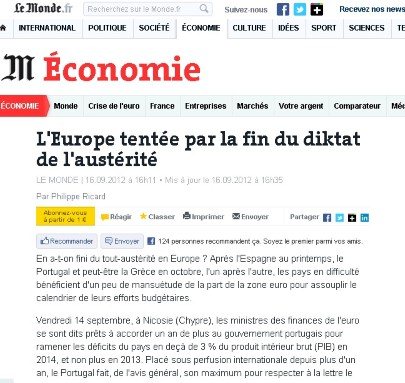 «Τελειώνουμε με τη λιτότητα στην Ευρώπη; Μετά την Ισπανία, την Πορτογαλία και πιθανόν την Ελλάδα τον Οκτώβριο, η μια μετά την άλλη, οι χώρες που βρίσκονται σε κρίση καλούνται από την Ευρωζώνη να ελαφρύνουν τα μέτρα λιτότητας» υποστηρίζει η γαλλική εφημερίδα.