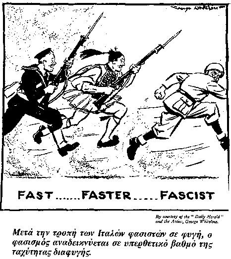 Ακόμη και σε περιόδους δύσκολες όπως είναι ένας πόλεμος το χιούμορ δεν λείπει, για να μην πούμε ότι επιβάλλεται. Η πένα του σκιτσογράφου μετατρέπεται σε όπλο και επηρεάζει τη διαμόρφωση της ψυχολογίας του λαού και του στρατού. Ας δούμε μερικά χαρακτηριστικά σκίτσα σχετικά με την εισβολή των δυνάμεων του Άξονα στη χώρα μας και την ανδρεία που επέδειξαν οι Έλληνες.
