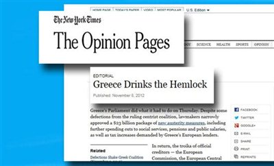 «Η Ελλάδα πίνει το κώνειο» είναι ο τίτλος του κύριου άρθρου των New York Times όπου σχολιάζεται η ψήφιση του τρίτου μνημονίου από το κοινοβούλιο.