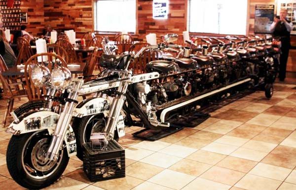 Με μήκος που ξεπερνάει τα 25 μέτρα και επτά κινητήρες, οι δέκα αναβάτες δεν μπορεί παρά να αισθάνονται ευτυχισμένη πάνω σε ένα από τα δερμάτινα καθίσματα της εντυπωσιακής όσο και παράξενης Harley-Davidson Timeline.