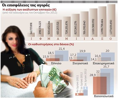 Η πολυετής ύφεση που πλήττει την ελληνική οικονομία έχει αυξήσει τον αριθμό των αφερέγγυων νοικοκυριών και επιχειρήσεων κατά τουλάχιστον 50% μετά το ξέσπασμα της κρίσης χρέους, αποκλείοντας περισσότερους από 1,5 εκατομμύριο δανειολήπτες από το τραπεζικό σύστημα. Από τις αρχές του 2010 ως σήμερα έχουν «σφραγιστεί» επιταγές άνω των 5 δισ. ευρώ, ενώ οι καθυστερήσεις στα δάνεια έχουν διπλασιαστεί, σκαρφαλώνοντας από το 13% στο τέλος του 2009 πάνω από το 25%, ποσοστό που αντιστοιχεί σε επισφάλειες της τάξεως των 59 δισ. ευρώ.