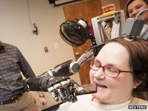 Οι Αμερικανοί επιστήμονες από το Πανεπιστήμιο του Πίτσμπουργκ, με επικεφαλής τον καθηγητή Andrew Schwartz, βοήθησαν την 53χρονη Jan Scheuermann, που πάσχει από εκφύλιση της σπονδυλικής στήλης, να πιάσει και να μετακινήσει αντικείμενα, με τη βοήθεια ρομποτικού χεριού.