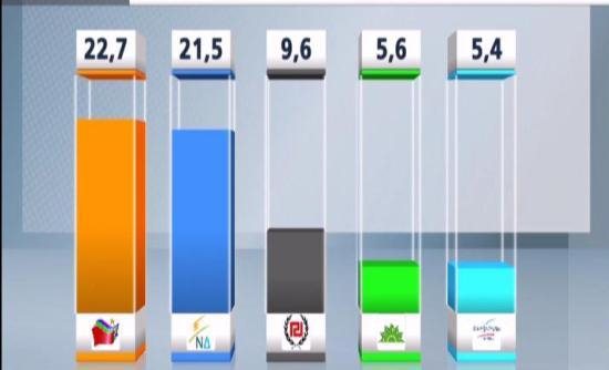 Ακολουθούν το ΠΑΣΟΚ με 5,6%, οι Ανεξάρτητοι Έλληνες με 5,4%, το ΚΚΕ με 4,7% και τέλος η ΔΗΜΑΡ 4,5%.