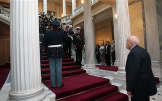 Η μπάντα των Ενόπλων Δυνάμεων και η Προεδρική Φρουρά έκαναν «ποδαρικό» με τα χριστουγεννιάτικα κάλαντα στον Κάρολο Παπούλια σήμερα, για τα «πουν» στη συνέχεια η χορωδία του Χατζηκυριάκειου Ιδρύματος, ο Πανηπειρωτικός Σύλλογος Μεσογείων και Λαυρεωτικής και ο Σύλλογος Φίλων Παιδιών με καρκίνο η «Ελπίδα».