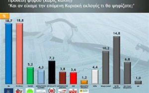 Ο ΣΥΡΙΖΑ έχει ένα ανεπαίσθητο προβάδισμα μόλις 0,1% στην πρόθεση ψήφου έναντι της Ν.Δ., ενώ η «ισοπαλία» αυτή αποτυπώνεται και στην εκτίμηση ψήφου με αναγωγή επί των εγκύρων: ΣΥΡΙΖΑ πρώτος με 28%, Ν.Δ. δεύτερη με 27,8%.