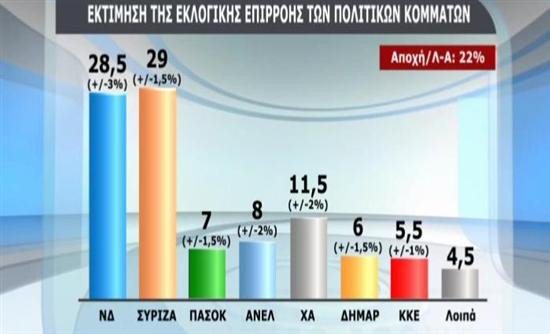 Συγκεκριμένα σύμφωνα με την δημοσκόπηση του ΣΚΑΙ και της Public Issue: Ο ΣΥΡΙΖΑ συγκεντρώνει 29% η ΝΔ 28,5% και ακολουθούν η Χρυσή Αυγή 11,5% οι Ανεξάρτητοι Έλληνες 8% το ΠΑΣΟΚ 7% η ΔΗΜΑΡ 6% και το ΚΚΕ 5,5%