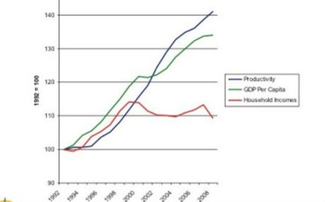 Οι δύο καμπύλες που κινούνται ανοδικά είναι το κατά κεφαλήν εισόδημα στις ΗΠΑ και η παραγωγικότητα. Η καμπύλη που δεν κινείται πια ανοδικά είναι αυτή που αναπαριστά τα εισοδήματα των νοικοκυριών. Με άλλα λόγια, Παρά το γεγονός ότι η παραγωγικότητα και το κατά κεφαλήν ΑΕΠ αυξάνονται αλματωδώς, τα εισοδήματα των νοικοκυριών παραμένουν στα ίδια επίπεδα.