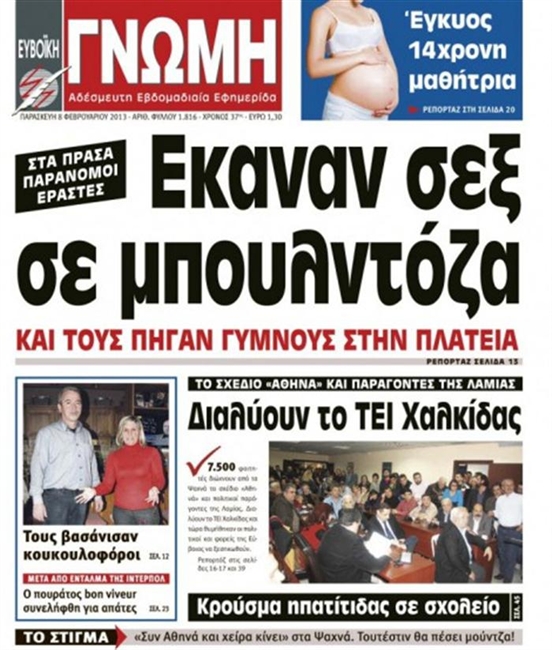 «Έκαναν σεξ σε μπουλντόζα και τους πήγαν γυμνούς στην πλατεία»! Μια ιστορία διαπόμπευσης σε χωριό της Εύβοιας ήταν το πρωτοσέλιδο της τοπικής εφημερίδας της Εύβοιας «Ευβοϊκή Γνώμη», που κυκλοφόρησε στις 8 Φεβρουαρίου.