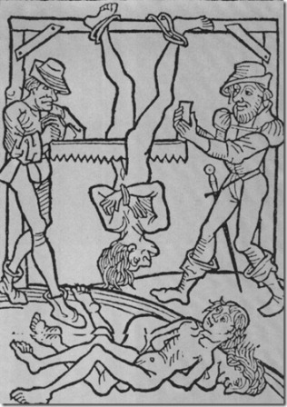 Ο μελλοθάνατος κρεμιέται ανάποδα από τους αστραγάλους του και ο εκτελεστής αρχίζει να πριονίζει το σώμα του σιγά σιγά ξεκινώντας από τον καβάλο με κατεύθυνση προς το κεφάλι.