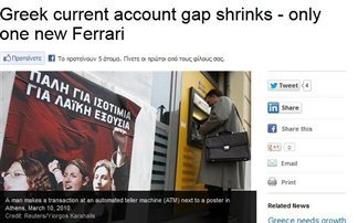 «Ωστόσο, αποκαλυπτικά στατιστικά στοιχεία έδειξαν πως ο επιδεικτικός τρόπος ζωής είναι πλέον έξω από τη μόδα στη χρεοκοπημένη Ελλάδα. Μόνο ένα νέο σπορ αυτοκίνητο Ferrari έχει καταχωρηθεί σε εθνικό επίπεδο στο σύνολο των αγορών για το 2012. Αυτό, συν ένα άλλο μεταχειρισμένο Ferrari που πωλήθηκε, σε αντίθεση με 21 ολοκαίνουργια και 37 μεταχειρισμένα που καταγράφηκαν στις πωλήσεις εντός του 2007, το τελευταίο έτος πριν η ύφεση χτυπήσει την Ελλάδα», επισημαίνεται στο Reuters, όπου υπογραμμίζεται πως «το έλλειμμα των τρεχουσών συναλλαγών συρρικνώθηκε στο 2,9 % του ακαθάριστου εγχώριου προϊόντος (ΑΕΠ) το 2012 από 9,9 % το προηγούμενο έτος - το χαμηλότερο ποσοστό τουλάχιστον από το 1999, σύμφωνα με τα διαθέσιμα στοιχεία».