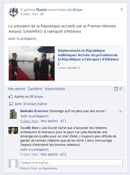 Μέσω της σελίδας της Γαλλικής Προεδρίας προσφερόταν στους φίλους της σελίδας σύμφωνα με το iefimerida, η δυνατότητα να παρακολουθήσουν ζωντανά τις δηλώσεις του Γάλλου προέδρου και του Ελληνα πρωθυπουργού.
