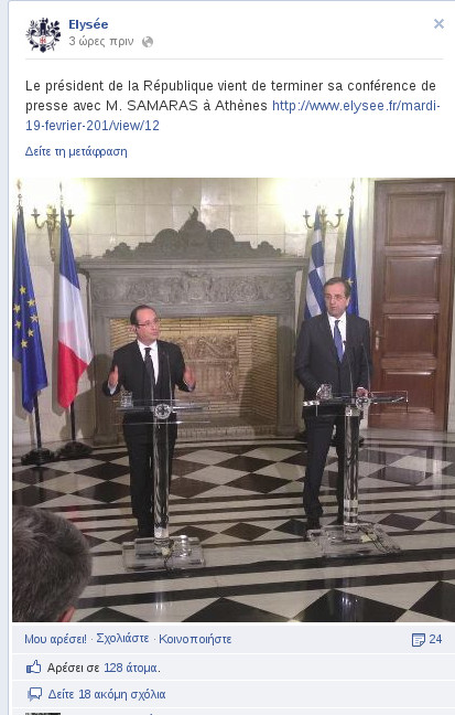 Κάτι ανάλογο συνέβη και στο λογαριασμό της Γαλλικής Προεδρίας στο Facebook, όπου πάλι ως φωτογραφία εξωφύλλου επιλέχθηκε να τοποθετηθεί μια εικόνα από τη συνάντηση Ολάντ-Σαμαρά.
