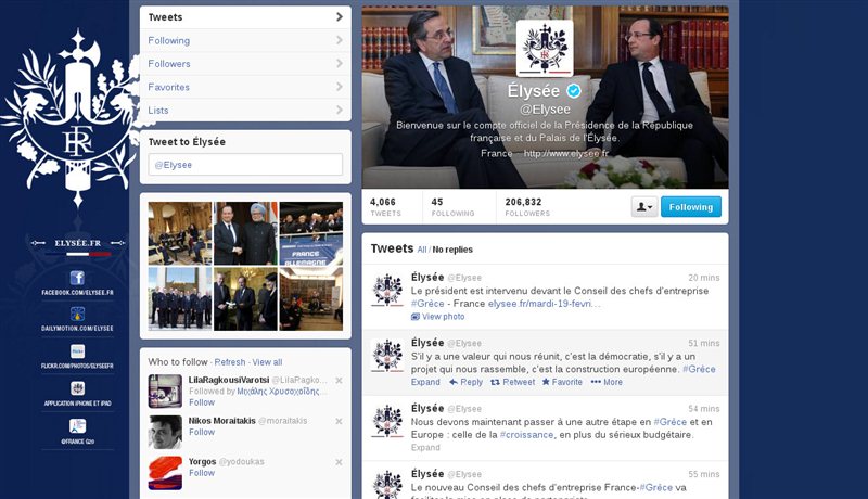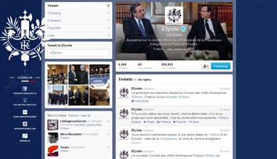 Μέσω του λογαριασμού της Γαλλικής Προεδρίας στο Twitter, με απανωτά tweets, οι συνεργάτες του κ. Ολάντ ενημέρωναν τους followers του για κάθε του κίνηση, ενώ η φωτογραφία που φιγουράρει στην κορυφή του λογαριασμού είναι ένα στιγμιότυπο από τη συνάντησή του με τον Ελληνα πρωθυπουργό στο Μέγαρο Μαξίμου.