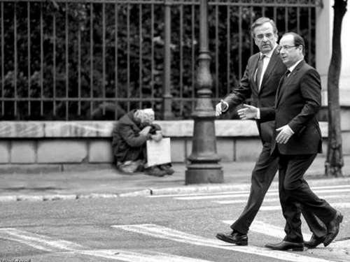 Προϊόν μοντάζ η φωτογραφία ή πραγματική; Και σα να αδιαφορούν πολύ ο Γάλλος πρόεδρος με τον Έλληνα Πρωθυπουργό στην εικόνα ενός άστεγου...