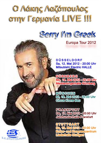Σε επτά ευρωπαϊκές πόλεις θα βρεθεί τον Μάιο ο Λάκης Λαζόπουλος και η σατιρική θεατρική του παράσταση «Sorry I'm Greek».Πρόκειται για ένα νέο θεατρικό έργο στο οποίο ο Λάκης Λαζόπουλος, με τον γνωστό του τρόπο, σατιρίζει τον Γιώργο Παπανδρέου, τον Κώστα Καραμανλή, τον Πάγκαλο, τον Βενιζέλο και άλλους πολιτικούς, που φρόντισαν, σύμφωνα με τον δημιουργό, να μας φέρουν εδώ που μας έφεραν.
