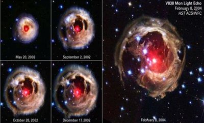Πρόκειται, σύμφωνα με tovima, για εικόνες που ξεκίνησε να καταγράφει το διαστημικό τηλεσκόπιο Hubble από την περιοχή που έγινε η έκρηξη τέσσερις μήνες μετά την εκδήλωσή της. Σε αυτές τις εικόνες εμφανίζεται η «ηχώ του άστρου, δηλαδή τα εντυπωσιακά δαχτυλίδια ύλης και η διόγκωση αλλά και επέκτασή τους στο διαστρικό κενό. Στην εικόνα του 2004 οι επιστήμονες εκτιμούν ότι τα δαχτυλίδια αυτά έχουν διάμετρο περίπου έξι έτη φωτός.
