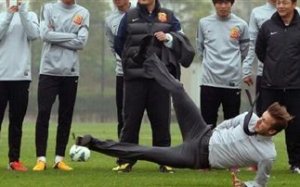 Ο Ντέιβιντ Μπέκαμ βρέθηκε αυτές τις μέρες στην Κίνα, με αφορμή τη διακοπή των πρωταθλητών λόγω των υποχρεώσεων που έχουν οι εθνικές ομάδες για το μουντιάλ του 2014, με σκοπό την προώθηση του ποδοσφαίρου στην ασιατική χώρα. Μάλιστα, ο σούπερ σταρ της Παρί Σεν Ζερμέν ήταν τόσο ευδιάθετος που ήθελε να δείξει και τις ικανότητές του στα νέα παιδιά της ομάδας από την επαρχία Γουάν. Ωστόσο, ο «Μπεκς» δεν φορούσε τα αθλητικά του, αλλά το κοστουμάκι του και τα σκαρπίνια του. Έτσι, σε μία προσπάθεια να βγάλει τη σέντρα, γλιστράει το ίσιο του –και σίγουρα ακριβό του παπούτσι- στο γρασίδι, με αποτέλεσμα να βρεθεί φαρδύς-πλατύς στον αγωνιστικό χώρο. sportfm