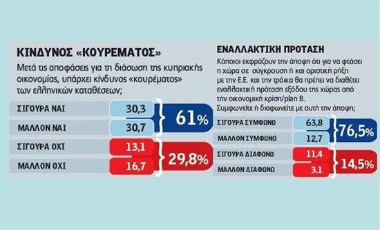 Μπορεί τις τελευταίες ημέρες, συντονισμένα και εμφατικά, το κυβερνητικό επιτελείο να αποκηρύττει οποιαδήποτε σκέψη για «κούρεμα» σε ελληνικές καταθέσεις, όμως οι πολίτες έχουν άλλη γνώμη. Σε ποσοστό 61% θεωρούν ότι υπάρχει κίνδυνος «κουρέματος» ελληνικών καταθέσεων, την ώρα που οι «αισιόδοξοι» δεν ξεπερνούν το 29,8%.