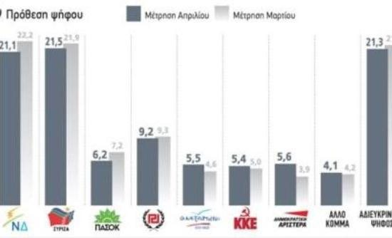 Πιο συγκεκριμένα στη δημοσκόπηση της Pulse RC για την εβδομαδιαία εφημερίδα «6μέρες» ο ΣΥΡΙΖΑσυγκεντρώνει στην πρόθεση ψήφου το 20% της προτίμησης έναντι 19,5% της ΝΔ.