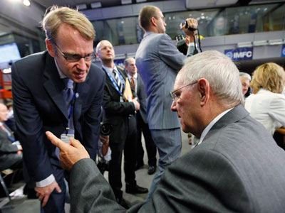 Από την πλευρά του ο Γερμανός υπουργός Οικονομικών, αναφερθείς στον στόχο του G20 για μείωση των ελλειμμάτων, σημείωσε ότι τα τελευταία χρόνια τα ελλείμματα στην ευρωζώνη έχουν μειωθεί σχεδόν στο ήμισυ ενώ εμφανίστηκε ενοχλημένος που η συνάντηση στην Ουάσιγκτον δεν φαίνεται να καταλήγει σε μια συνέχιση των στόχων.