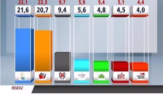 Ειδικότερα, στην πρόθεση ψήφου η ΝΔ συγκεντρώνει 21,6% και ο ΣΥΡΙΖΑ 20,7%. Ακολουθούν η Χρυσή Αυγή με 9,4%, οι Ανεξάρτητοι Έλληνες με 5,6%, το ΠΑΣΟΚ με 4,8%, το ΚΚΕ με 4,5%, η ΔΗΜΑΡ με 4%, Συμφωνία για την Ελλάδα 1,6%, Σχέδιο Β 1,5%, Δημιουργία Ξανά 1,1% και Οικολόγοι 1,1%. Ένα ποσοστό 3,5% απάντησε άλλο κόμμα. Αποχή/Λευκό/Άκυρο απάντησε το 10,4%, ενώ αδιευκρίνιστη είναι η ψήφος του 10,2% των ερωτηθέντων.