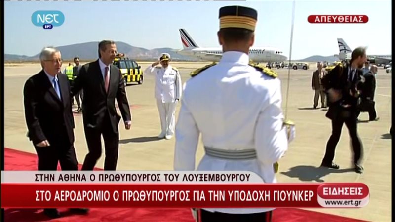 Πριν από λίγο προσγειώθηκε ο Πρωθυπουργός του Λουξεμβούργου Ζαν Κλοντ Γιούνκερ στην Αθήνα. Επίσημη επίσκεψη πραγματοποιεί στη χώρα μας και στο αεροδρόμιο "Ελ. Βενιζέλος" τον υποδέχθηκε ο Πρωθυπουργός Αντώνης Σαμαράς....