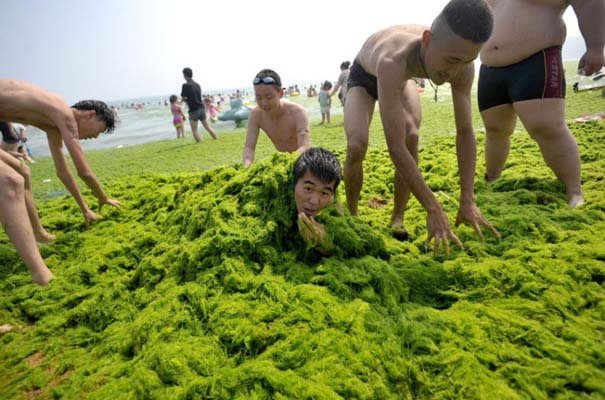 Οι ακτές της Κίτρινης Θάλασσας στην Κίνα έγιναν τις τελευταίες μέρες κυριολεκτικά πράσινες από το μεγαλύτερο κύμα άλγης που έχει παρατηρηθεί ποτέ, σύμφωνα με τους ειδικούς. Το φαινόμενο που συνήθως προκαλείται από την αφθονία των θρεπτικών ουσιών στο νερό, ειδικά του φωσφόρου, ξεκίνησε πριν από μια εβδομάδα και σιγά σιγά κάλυψε μια έκταση 28.900 τετραγωνικών χιλιομέτρων. Αυτό πάντως δεν πτόησε τους λουόμενους στην πόλη του Qingdao, που σύμφωνα με το otherside, δεν δίστασαν να κολυμπήσουν και να παίξουν μέσα στην πρασινάδα. Άλλωστε η άλγη δεν είναι τοξική, ούτε βλαβερή για την ποιότητα του νερού.