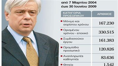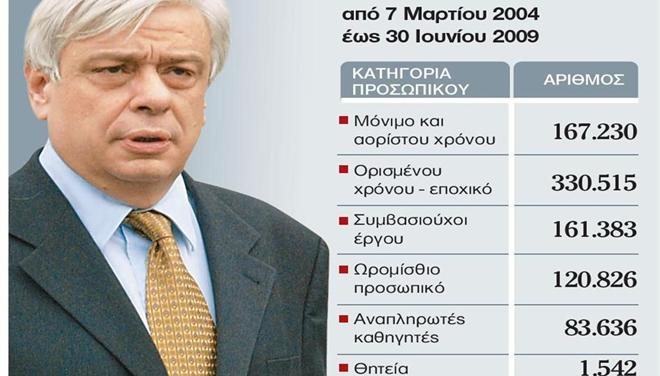 Κατά το διάστημα 2004-2009 και με τη βούλα του τότε υπουργού Δημόσιας Διοίκησης Προκόπη Παυλόπουλου, που ενέκρινε τις σχετικές αποφάσεις, έγιναν περισσότερες από 865.000 προσλήψεις δημοσίων υπαλλήλων. Πρόκειται για αριθμό που αντιστοιχεί στο 129% του σημερινού υπηρετούντος προσωπικού, με δεδομένο ότι σε όλο τον δημόσιο τομέα απασχολούνται τώρα περίπου 670.000 υπάλληλοι.