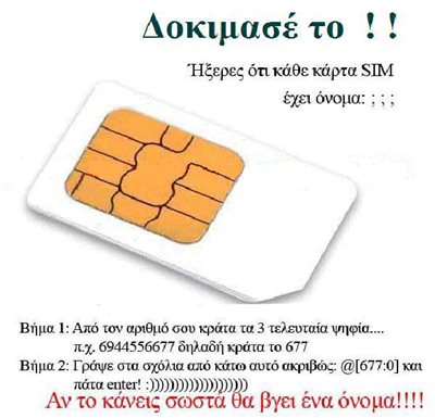 ΒΗΜΑ 1ο: Από τον αριθμό σου κράτα τα τρία τελευταία ψηφία... παράδειγμα 6944556677 δηλαδή κράτα το 677 ΒΗΜΑ 2ο: Πάτα στα σχόλια από κάτω αυτό ακριβώς @[667:0] και πάτα comment. ΑΝ ΤΟ ΚΑΝΕΙΣ ΣΩΣΤΑ ΘΑ ΒΓΕΙ ΈΝΑ ΌΝΟΜΑ!!!