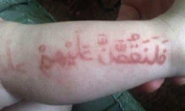 Τα σημάδια που εμφανίζονται στο σωματάκι του παιδιού έχουν ροζ ανοιχτό χρώμα και γράφουν σε τέλεια αραβική γραφή «Να είστε ευγνώμονες προς τον Αλλάχ».