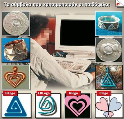 Οι παιδόφιλοι έχουν σύμβολα για να αναγνωρίζονται μεταξύ τους, τα οποία έχουν... κυκλοφορήσει σε κοσμήματα ακόμα και tatoo.Θα πρέπει να ενημερωθούν όλοι οι γνωστοί και φίλοι, έχουν δεν έχουν παιδιά . Εκείνοι με την σειρά τους μπορούν να ενημερώσουν άλλους και η αλυσίδα να σώσει ένα παιδί. Τα σύμβολα είναι: Το BLogo, «boylover» που συμβολίζεται από δύο μπλε τρίγωνα, το ένα μέσα στο άλλο, σε σπειροειδή μορφή, και υποδηλώνει την προτίμηση στα αγόρια. Το LBLogo, «littleboylover», που συμβολίζεται από ένα παρόμοιο σχέδιο του Blogo, χωρίς γωνίες, και υποδηλώνει την προτίμηση στα μικρά αγόρια. Το Glogo, «Girllover», που συμβολίζεται από δύο καρδιές η μία μέσα στην άλλη και υποδηλώνει την προτίμηση στα κορίτσια. Το Clogo, «Childlover», που συμβολίζεται από μια πεταλούδα που τα φτερά της έχουν σχήμα καρδιάς και υποδηλώνει την προτίμηση και στα δύο φύλα.