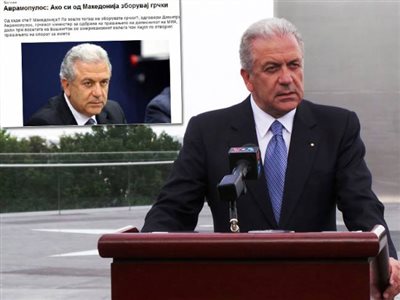 «Προσβολή Αβραμόπουλου. «Αν είστε απ’ τη Μακεδονία, μιλάτε ελληνικά» ο τίτλος του δημοσιεύματος της Courier. «Αν μιλάτε μακεδονικά, είστε Έλληνας» γράφει η Νova Makedonija.