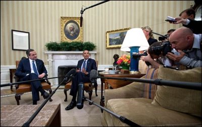 ΦΩΤΟ Reuters - Πάνω από 10 τηλεοπτικά συνεργεία παρακολουθούσαν τις κοινές δηλώσειςΟ κ. Ομπάμα είπε ακόμη ότι η Ελλάδα είναι σε μια περιοχή με προκλήσεις και δυσκολίες και μπορεί να παίξει σημαντικό σταθεροποιητικό ρόλο και να δώσει λύσεις στα προβλήματα μεταξύ των οποίων και αυτό της Κύπρου. Ο Αμερικανός πρόεδρος, κλείνοντας την τοποθέτησή του έκανε λόγο για εξαιρετική συζήτηση που είχε με τον Έλληνα πρωθυπουργό.